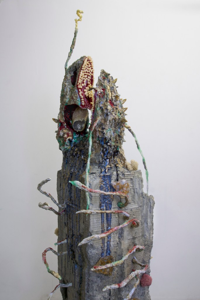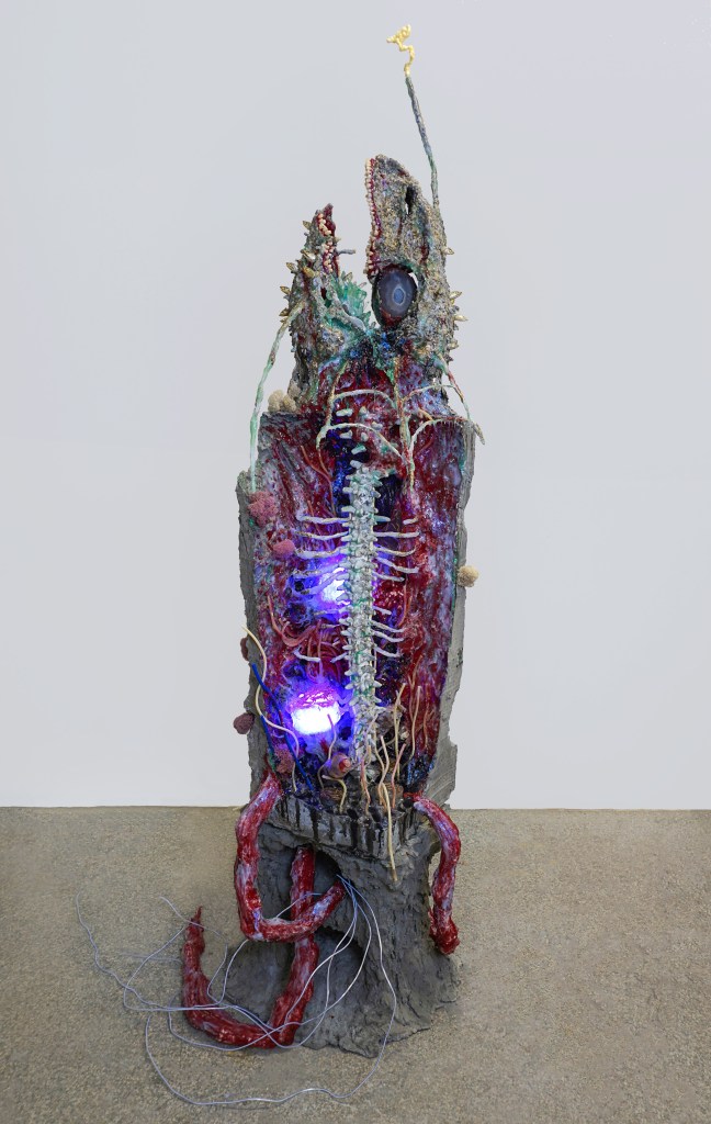 Untitled (Judy), agate geode, anchovy, mealworm, tube, condom, concrete, silicone, epoxy clay, resin, acrylic paint, LED, salt, found object, 74”×17.5”×18”, 2019