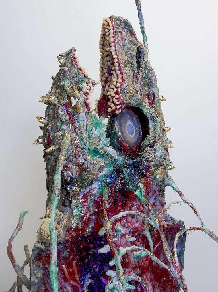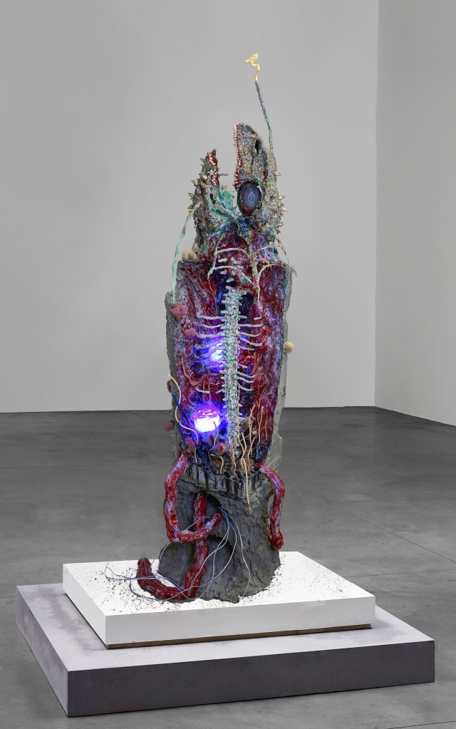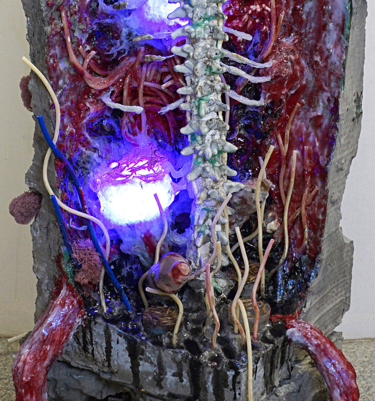 Untitled (Judy), agate geode, anchovy, mealworm, tube, condom, concrete, silicone, epoxy clay, resin, acrylic paint, LED, salt, found object, 74”×17.5”×18”, 2019