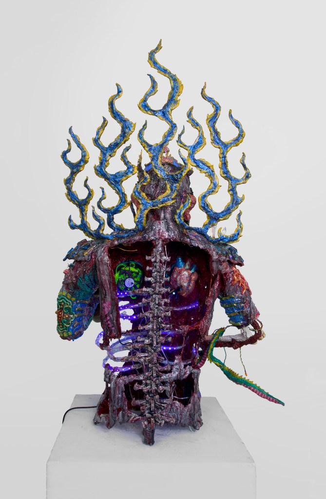 Warrior of Underground, light, coyote bone, resin, epoxy clay, silicone, mannequin, wire, plaster, found object, 56″x 25″x 13″, 2021