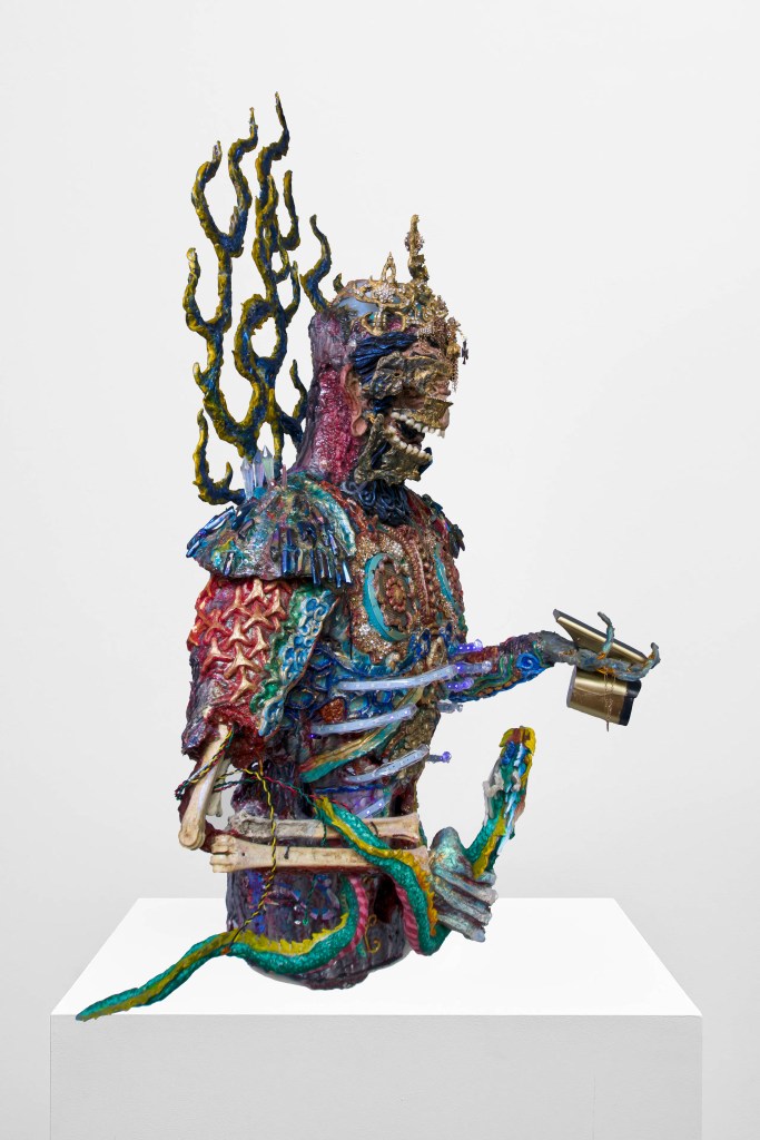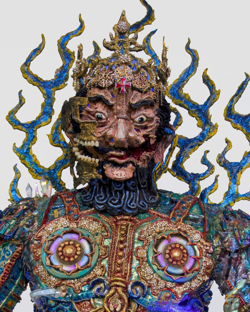 Warrior of Undersky, concrete, resin, epoxy clay, silicone, mask, agate geode, wire, plaster, feather, found object, 82″x 41″x 12″, 2021