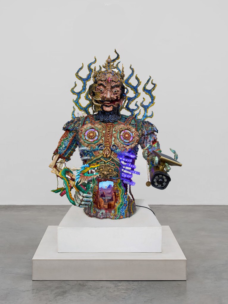King of Gwangmok, tablet, security camera, speaker, LED light, coyote bone, resin, epoxy clay, silicone, computer part, wire, plaster, artificial teeth, found object, 38”x 28”x23”, 2021