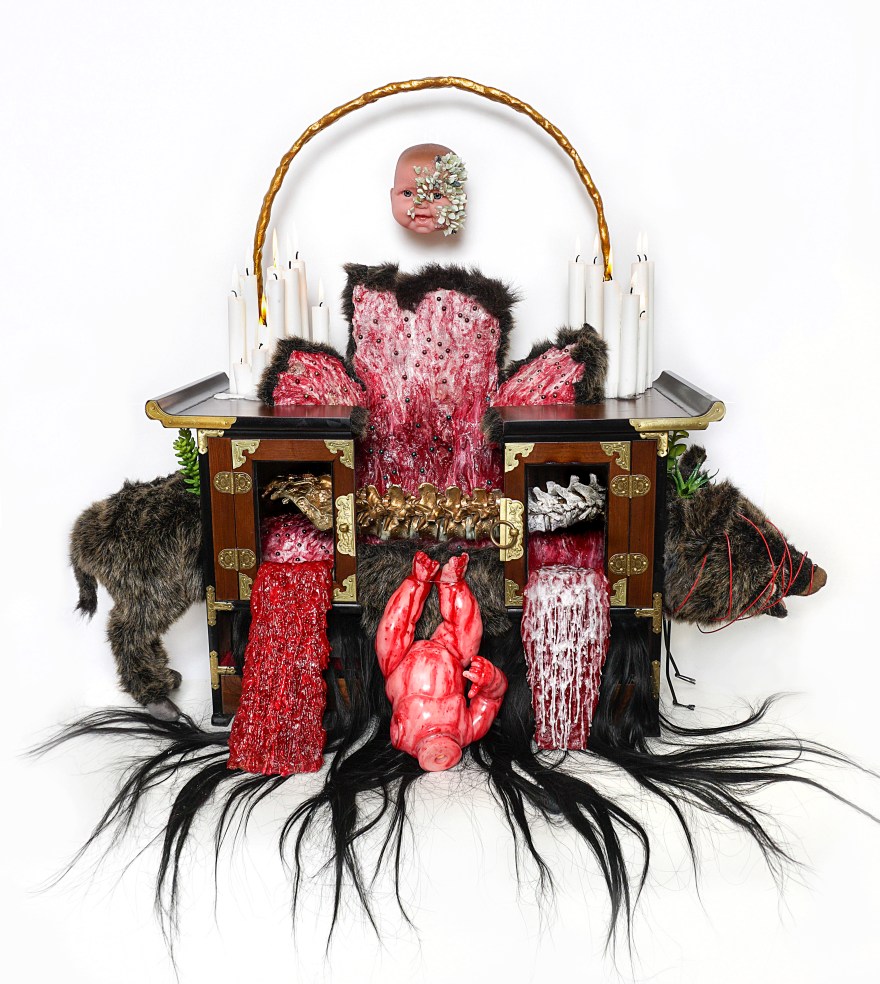The altar of boar, antique furniture, baby doll, stuffed animal, human dummy, paraffin, hair, silicon, mixed media, 78x90x42cm, 2017